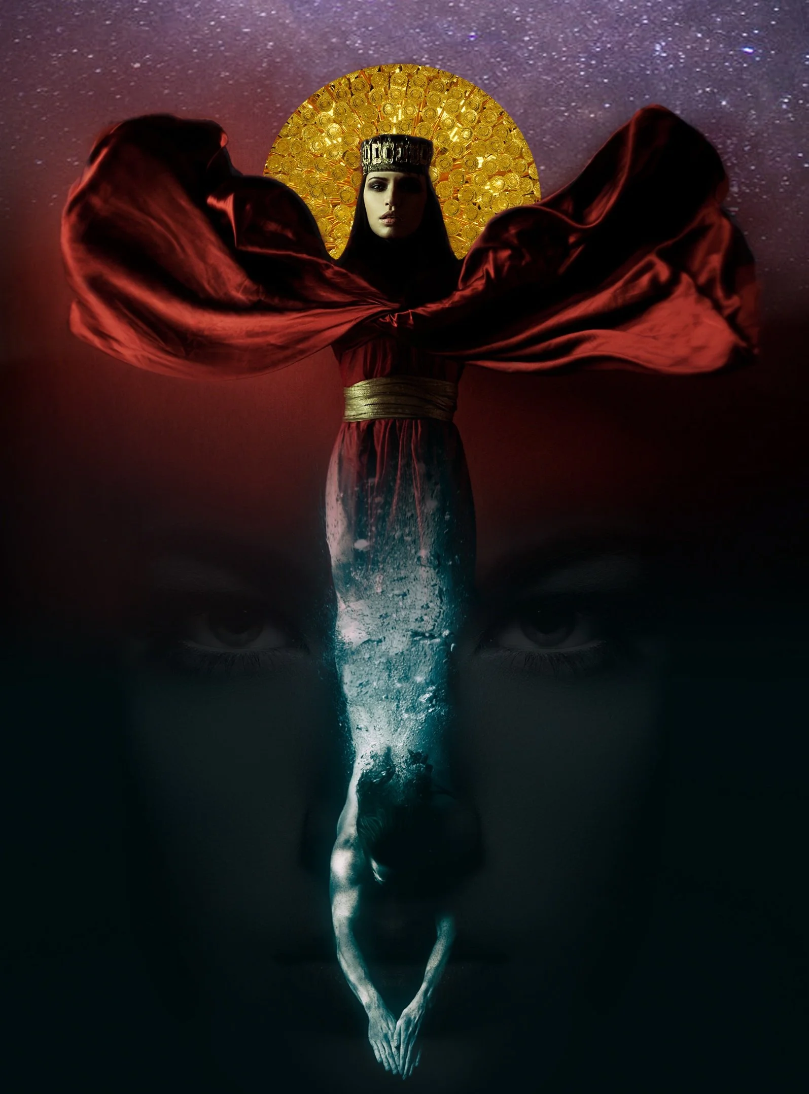 Her ritualistic descent embodies the eternal cosmic ballet, where life and death entwine in an intricate embrace - beckoning us to reconcile the light and the dark for true cosmic equilibrium.